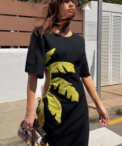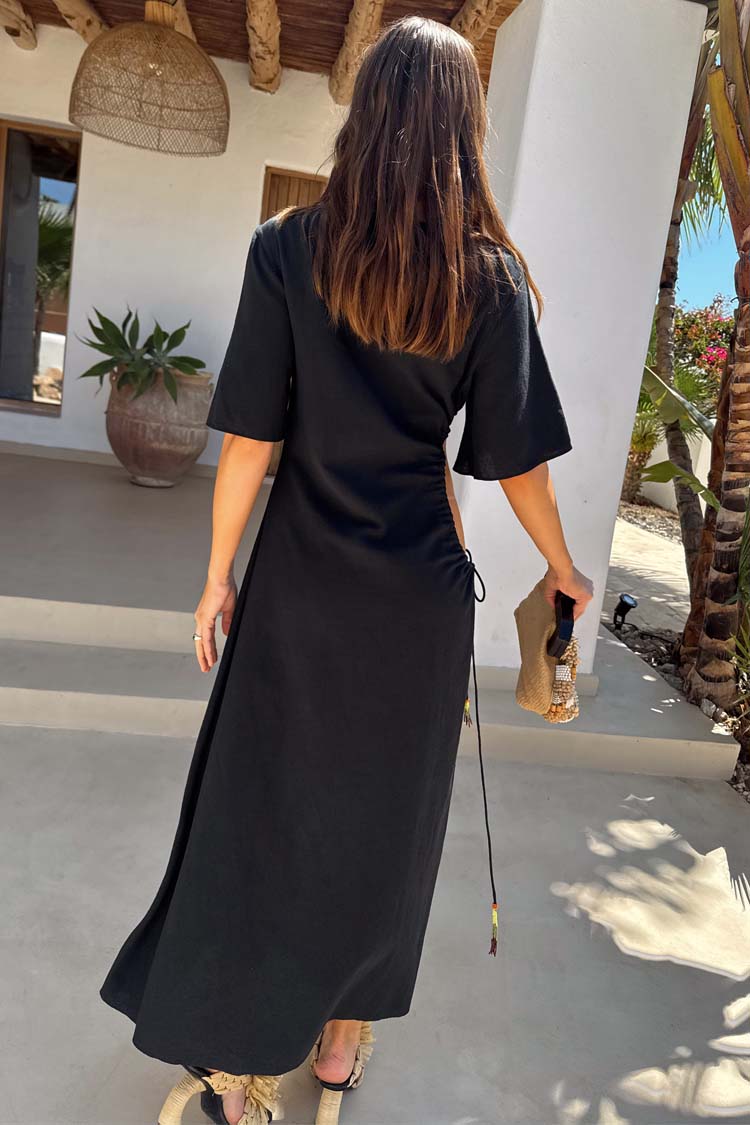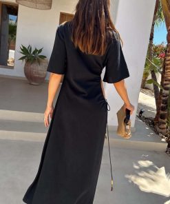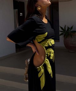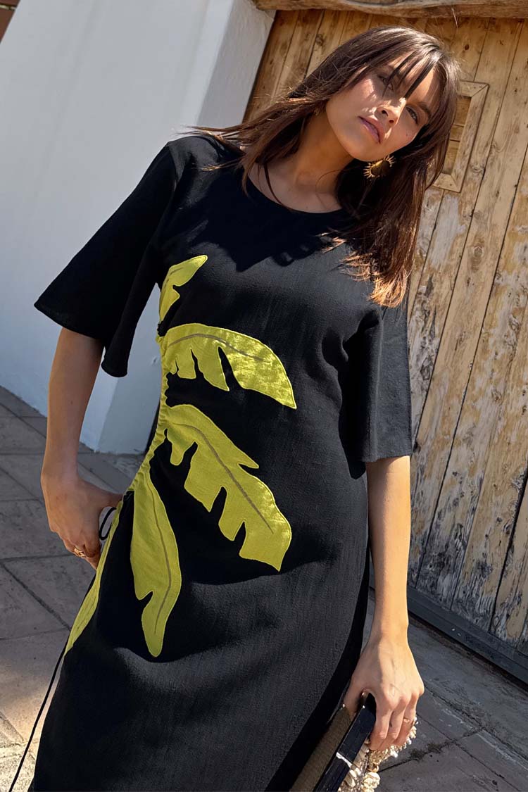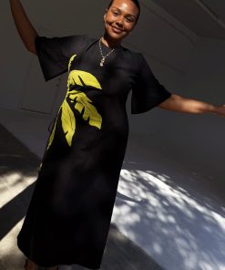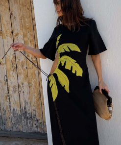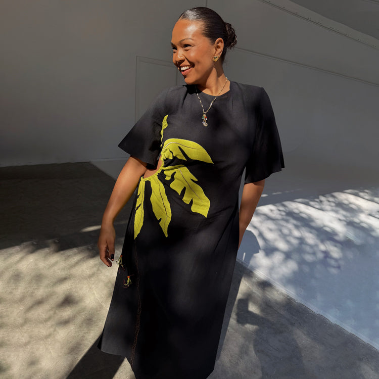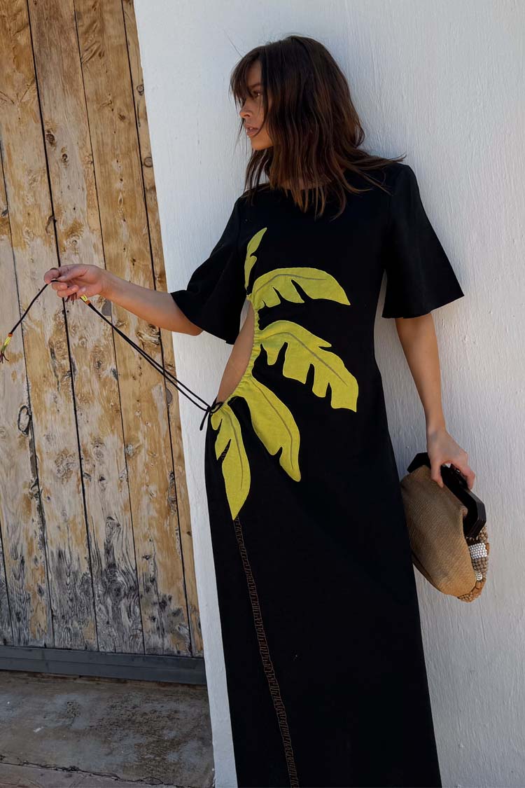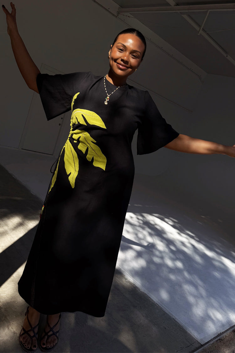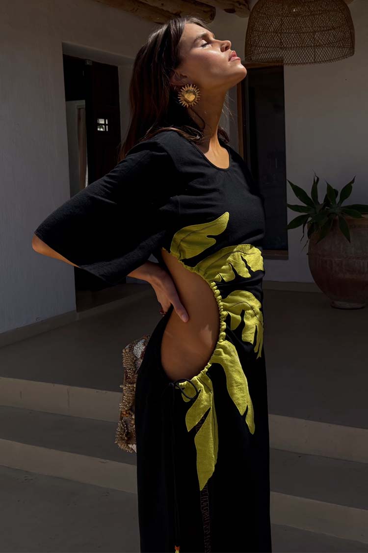 This dress is bring all the feel good vibes! A lightweight, cotton blend maxi dress suitable for dressing up or down. With our iconic palm motif accompanied by cut out detailing on the waist that can be adjusted to suit everybody! The relaxed silhouette makes this an definite holiday essential, whether it’s thrown over swimwear for an easy day out or paired with heels and a clutch for a casual night out look.