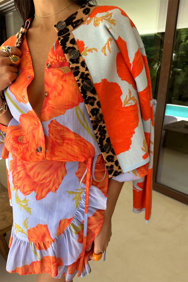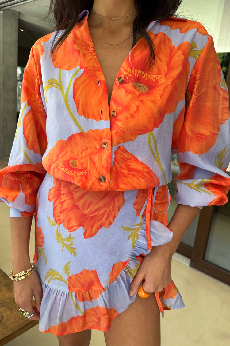 This skirt is the perfect way to elevate your spring/summer wardrobe! The bright and bold blue poppy print adds that touch of NFD flare while the wrap tie fastening allows you to tie in a myriad of ways to suit your body. With ruffle detailing along the front hem, pair with the matching shirt for an effortless co-ord or keep it casual with a white tee and some sneakers.