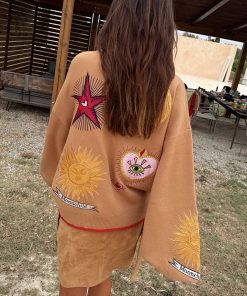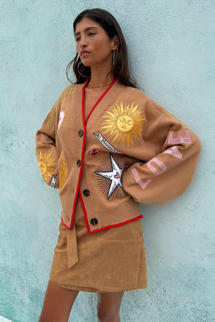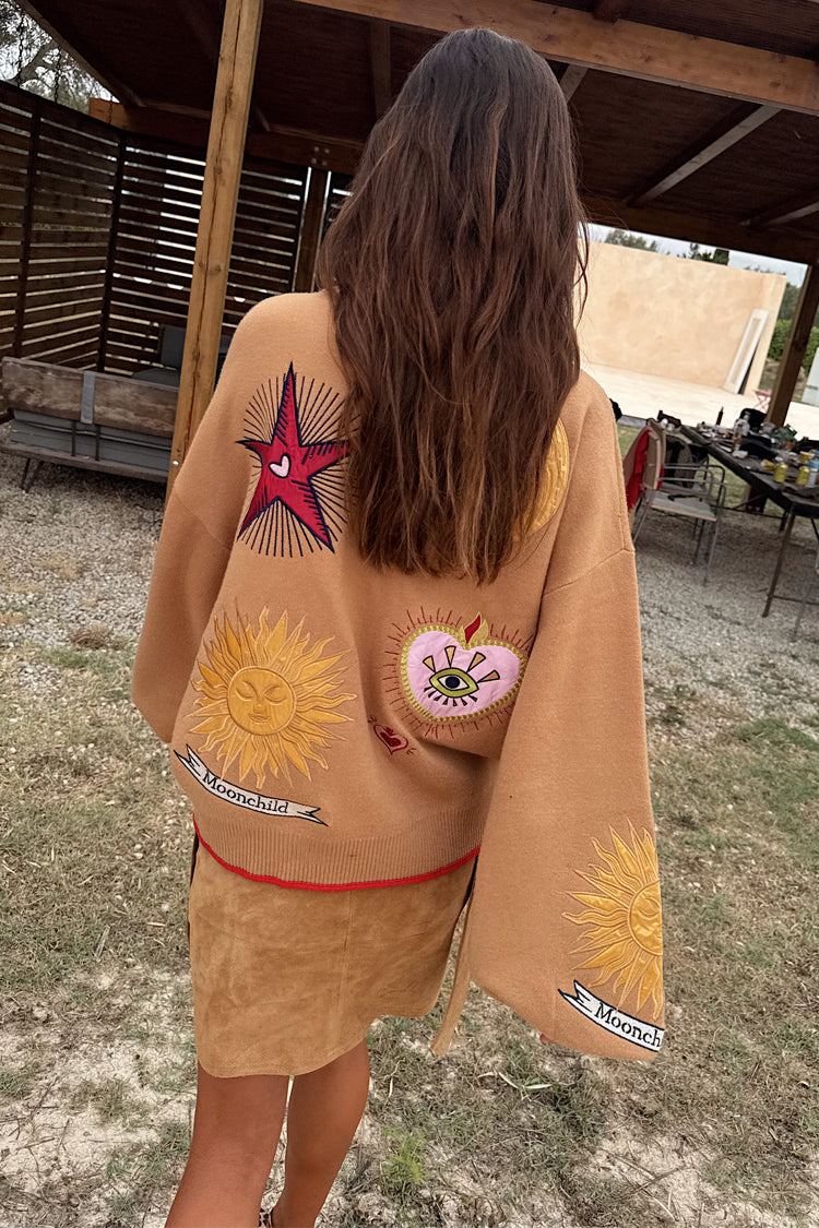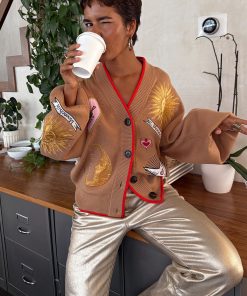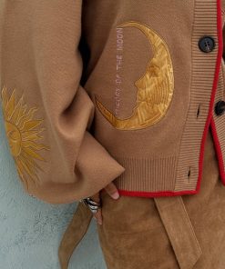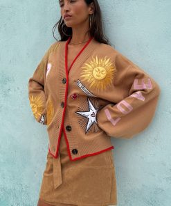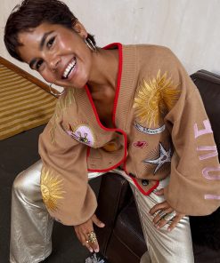 A light throw over for when it gets chilly in the evenings, with the thicker ribbed hems giving a slightly bomber-esque silhouette. The knitted fabric is so soft to the touch and feels weighty to drape the frame nicely. The beautiful embroidered motifs, inspired by the accents of gold and silver accompanied by engravings of suns and moons that can be found throughout the souks of Marrakech.