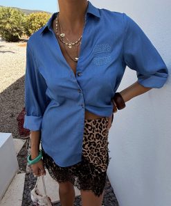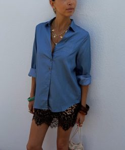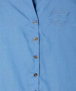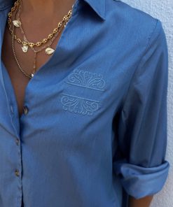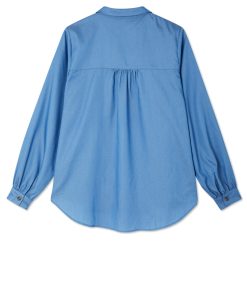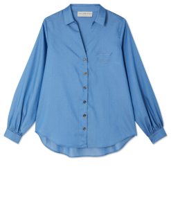 Our classic miley silhouette in a chambray blue, with blouson sleeve and floaty silhouette. A very slight sheerness for a luxe and lightweight feel but solid enough for everyday work wear. We have added contrast tortoise buttons for an extra touch of interest and gorgeous embroidered logo on the back neck. Perfect as a beach cover up, paired with a bikini or thrown over a maeva and styled with some heels for an effortless day to night fit!