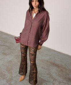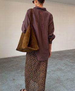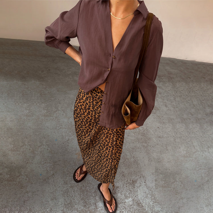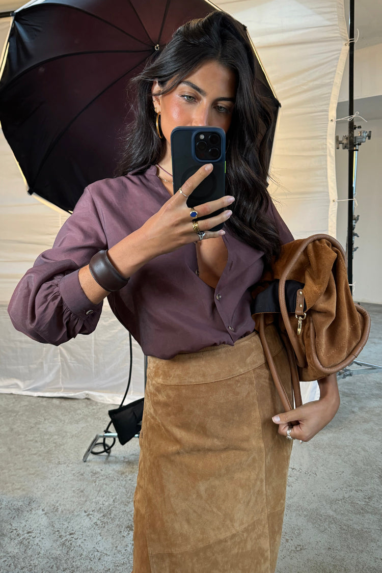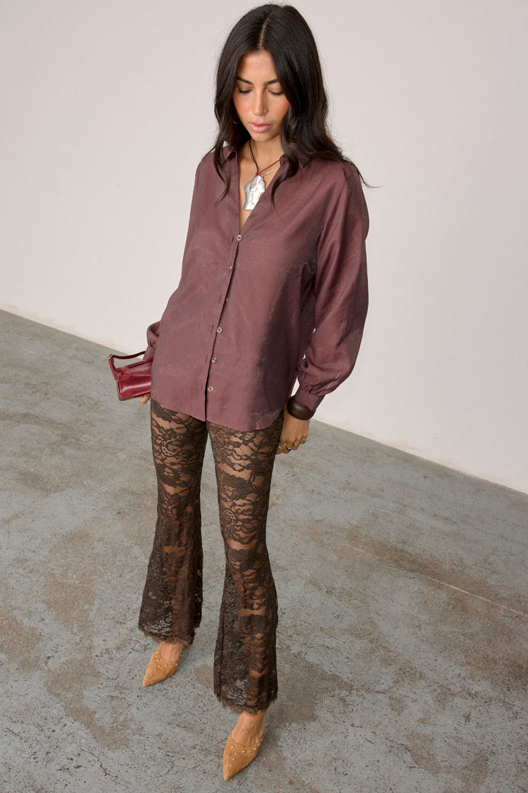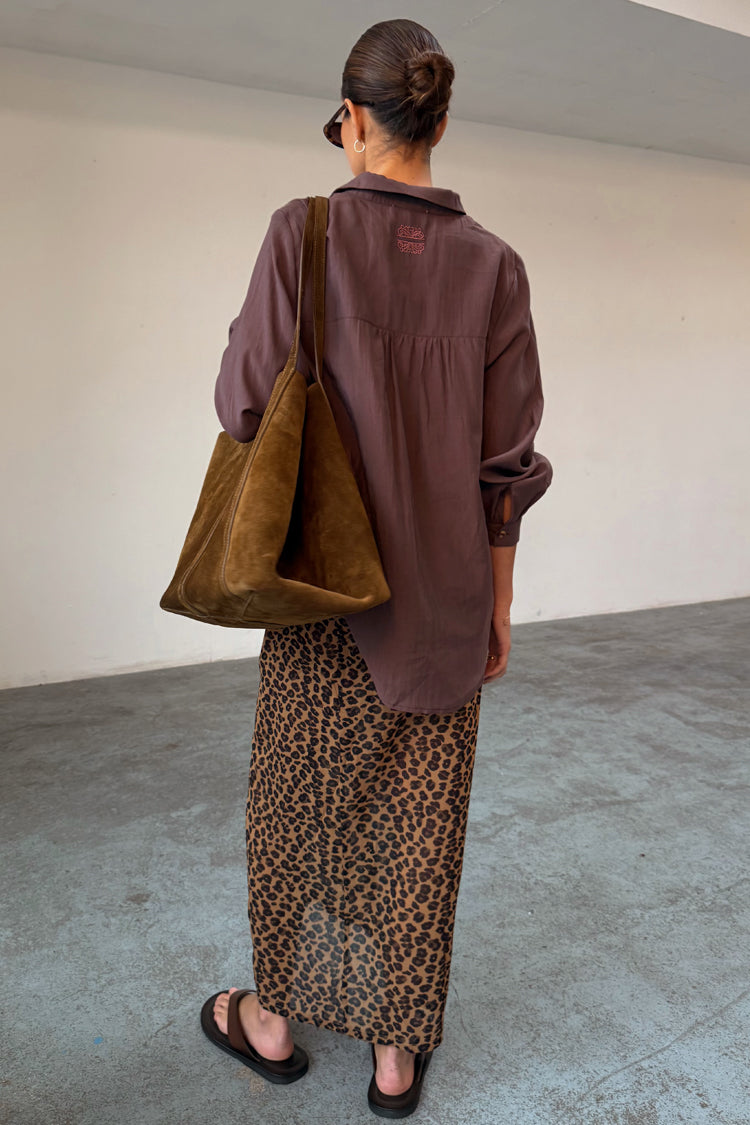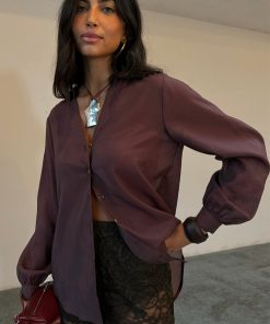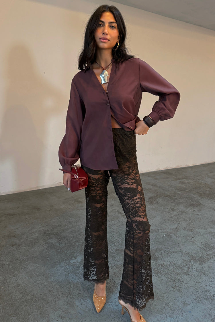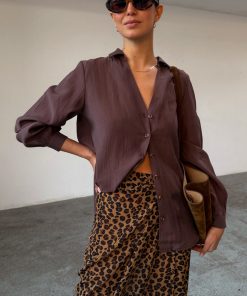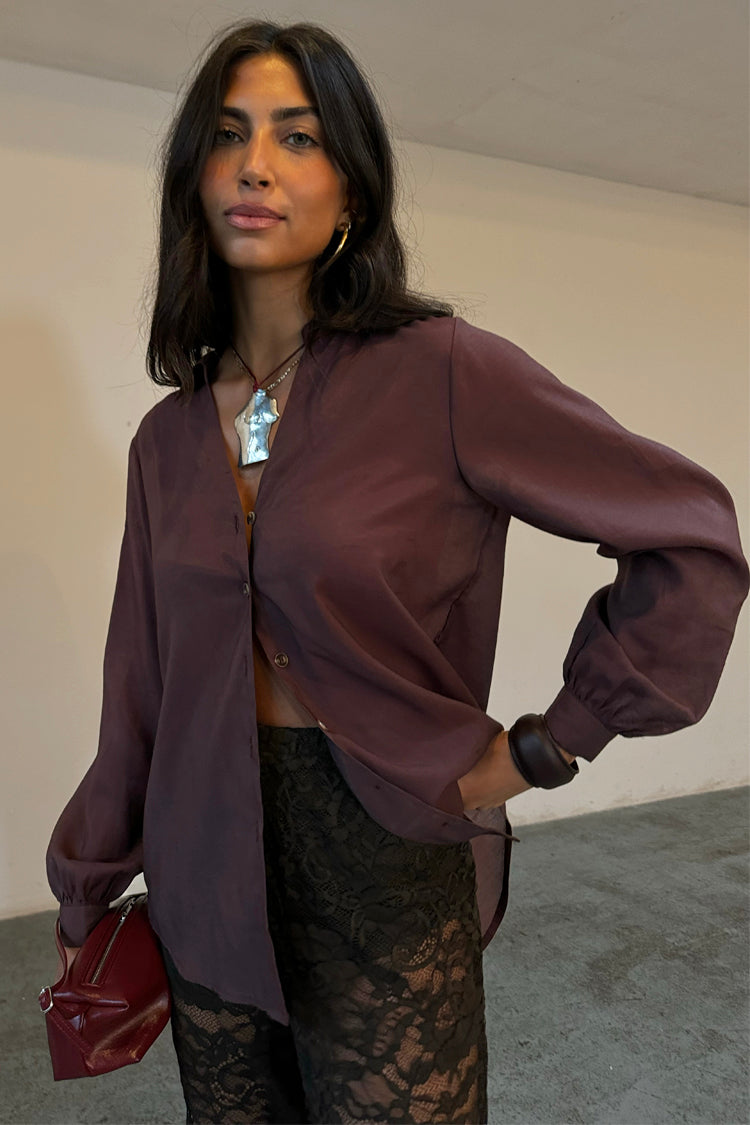 A super wearable chocolate brown shirt, with blouson sleeves and a floaty silhouette. A very slight sheerness for a luxe and lightweight feel but solid enough for everyday work wear. We have added contrast tortoise buttons for an extra touch of interest and gorgeous embroidered logo on the back neck.