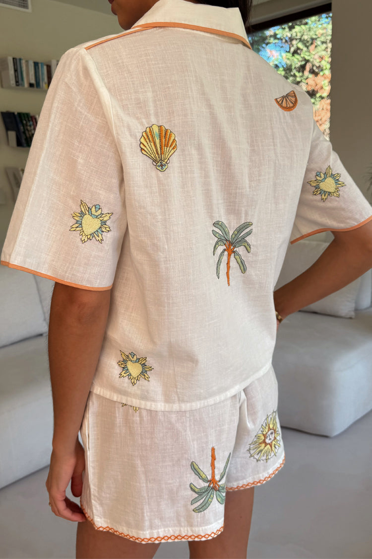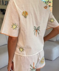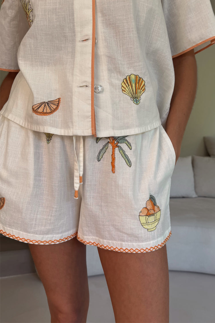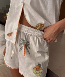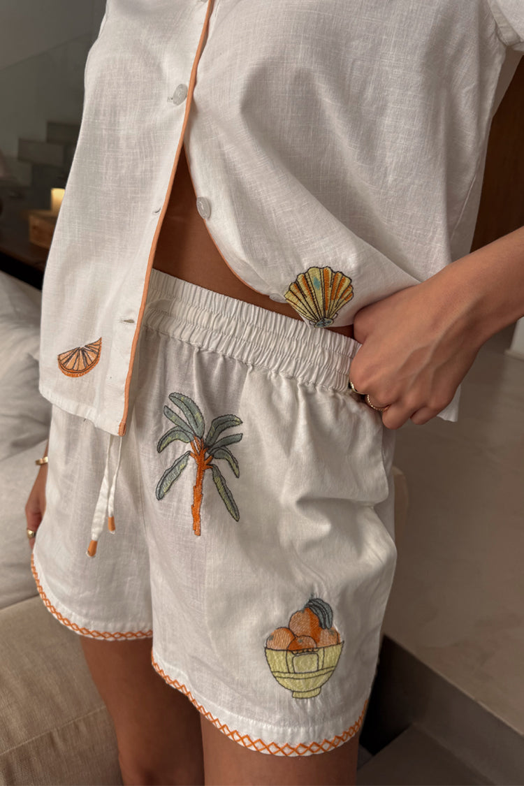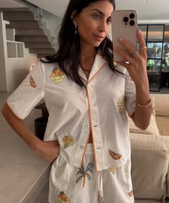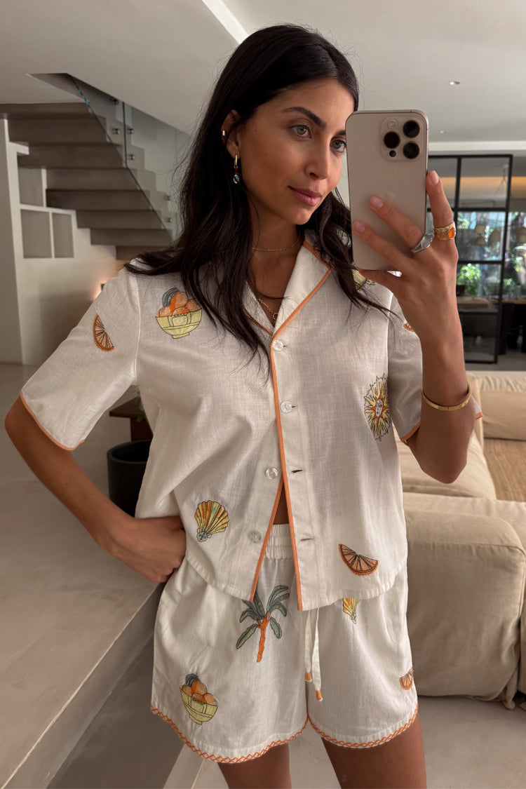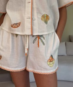 We’ve launched our summer nightwear collection! In a lightweight, breathable cotton, that’s perfect for the current heatwave, embroidered with some of our classic NFD motifs mixed with fun summer staples! The orange piping along the shirt and blanket stitich detailing on the shorts add another element of texture to the chic silhouette.