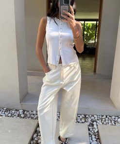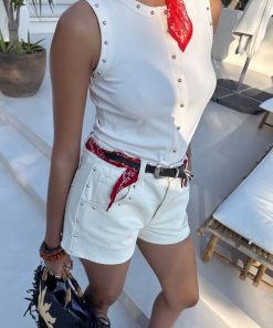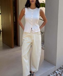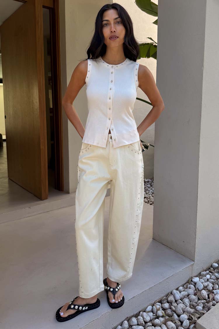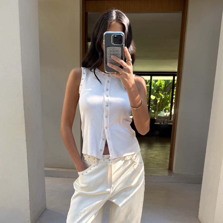 A simple ribbed tank but we’ve added stud detailing around the neckline, armholes and buttons to bring in a touch of colour and add a pop of NFD flare. Style with our studded barrel leg jeans for an easy, everyday monochrome outfit.