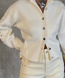Our stud range is our new way of elevating basic silhouette’s with a pop of texture and sparkle! With silver metal studs along the sleeves and on the back, adding that extra NFD touch, as well as twist stitch detailing on the hems. We’ve also added small darts on the front and back of the cardi to create a more structured look. Pair with the matching jeans for a easy monochrome outfit.