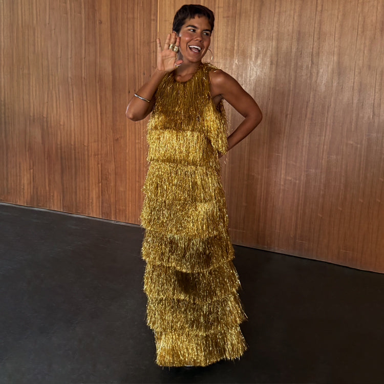 We’re starting the party early! With layered tassels, in a stunning gold foil, that move with you catching every flicker of light, it’s a definite head turner. Whether your stepping out for cocktails, hitting a rooftop bar with the girls or just adding a bit of sparkle to your everyday attire, this dress is bringing all the feel good vibes!