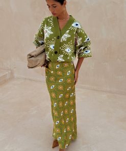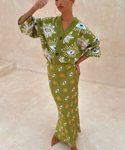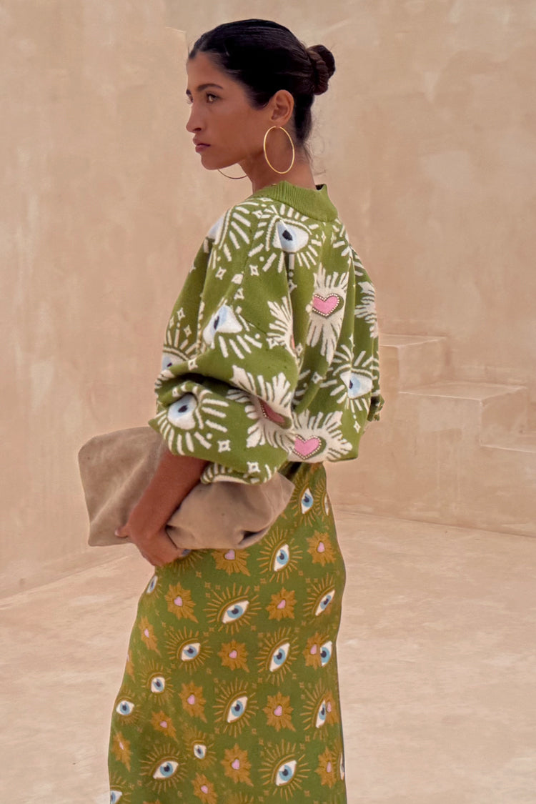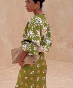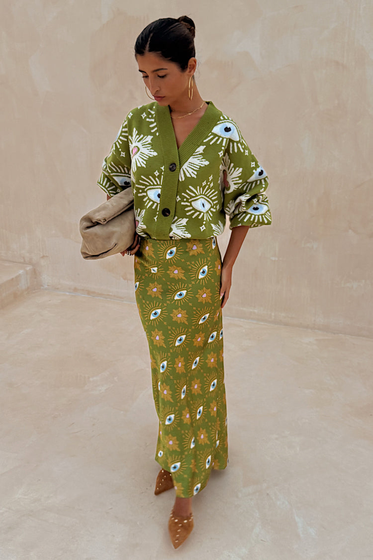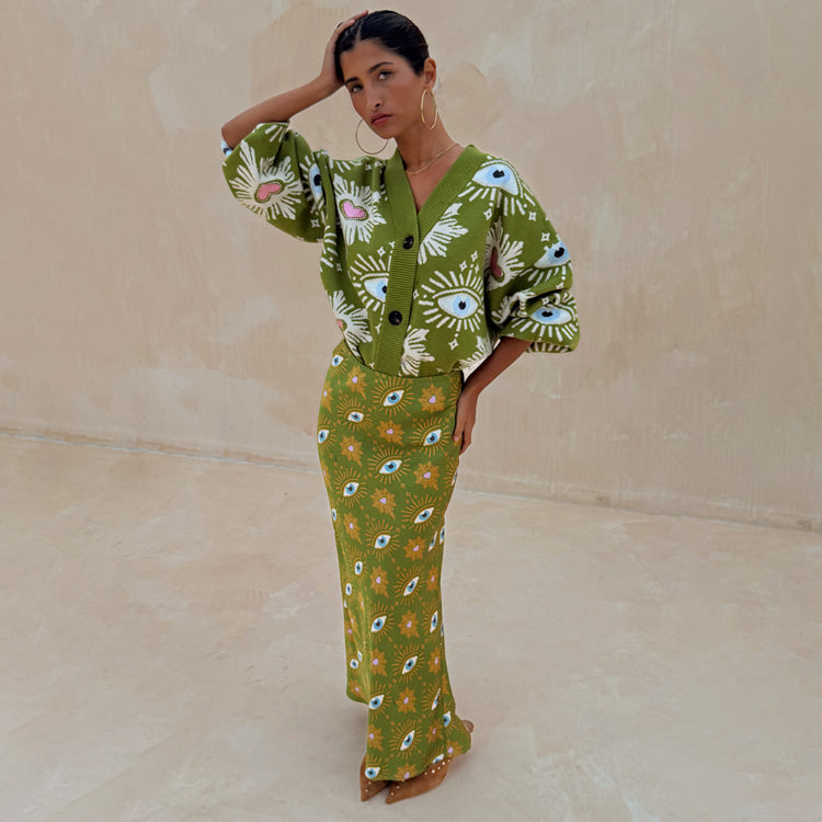 Our classic dorris silhouette in a new print featuring classic NFD motifs such as our heart & eye! The relaxed silhouette allows you to style with ease, whether it’s with a casual tee, swimwear for a stroll along the beach or paired with the matching cardigan and heels for a soft night out look.