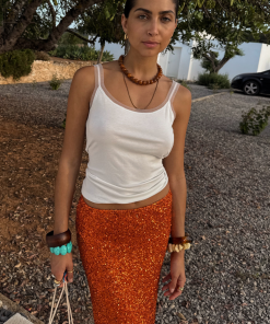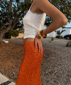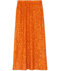 Crafted from hundreds of burnt orange sequins that shimmer in the light, it’ll take you from festivities through to festivals. With the silhouette of a slip skirt, lined with a heavy gloss satin to drape the figure flawlessly and ensure a non-scratch feel.
