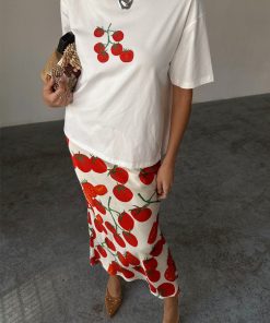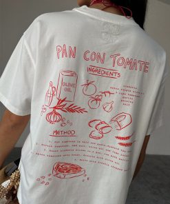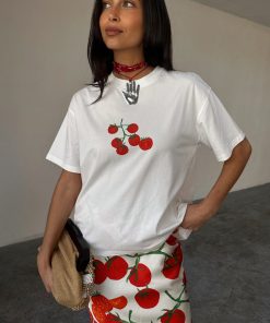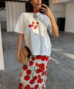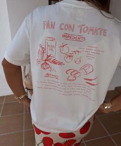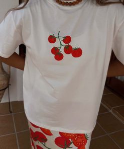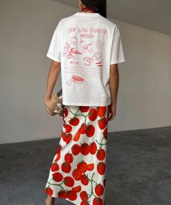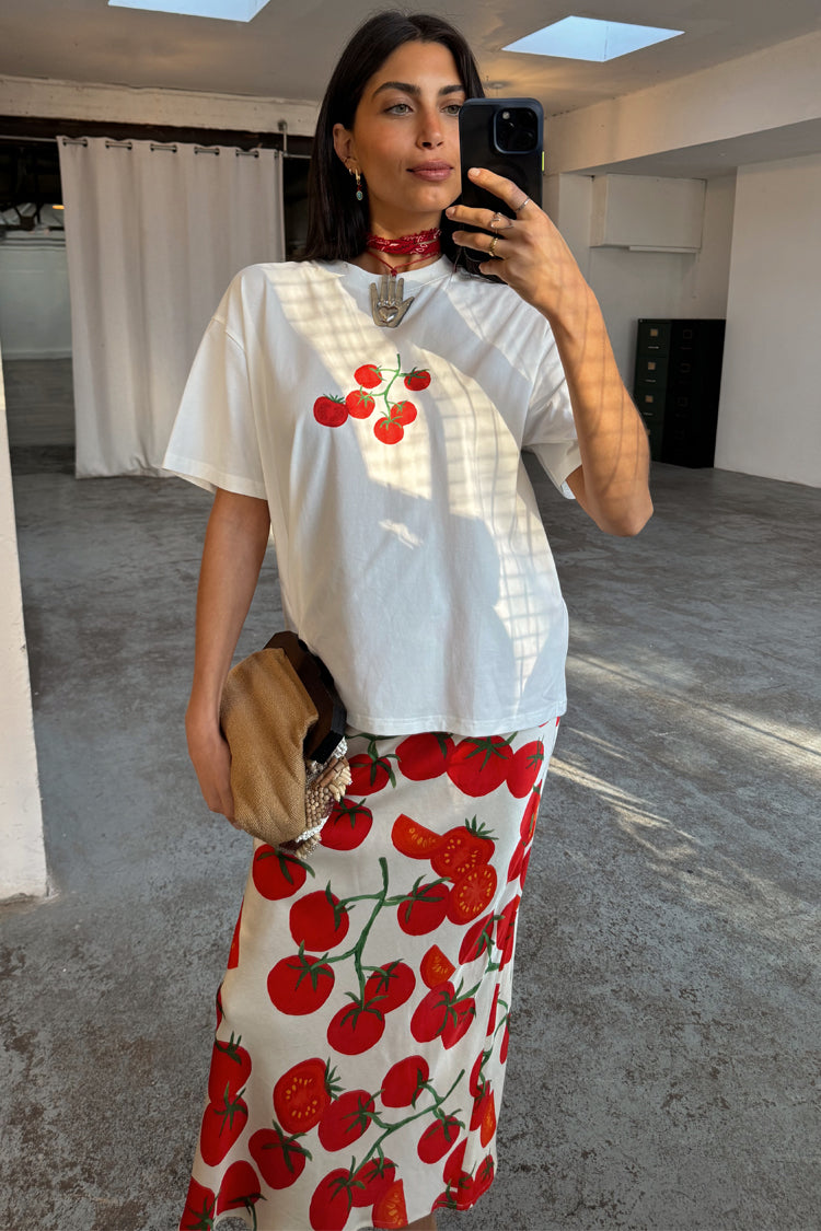 With statement tees making a comeback, we had to add our signature recipe design to the tomato range! A boxy relaxed fit and drop shoulder with a cute tomato print and recipe illustration, its great to throw on with some scallop jeans, or dress up with the matching dorris skirt and a heel.