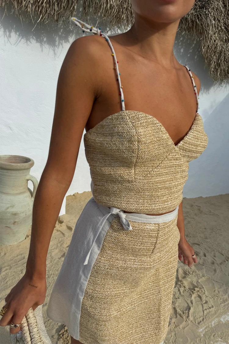 We’re loving the Raffia trend for spring/summer! With a raffia front panel, this skirt adds that extra element of texture you need in your holiday wardrobe! With a wrap tie fastening for extra security and comfortability, pair with the matching top and add some sandals for a stroll along the beach or throw on the raffia blazer and a heel for the perfect date night outfit.