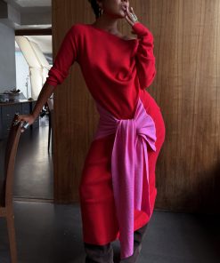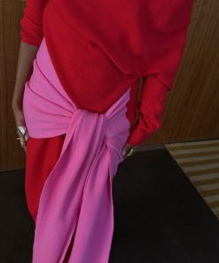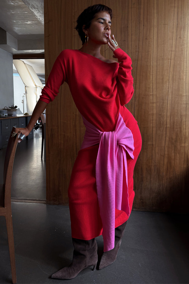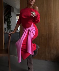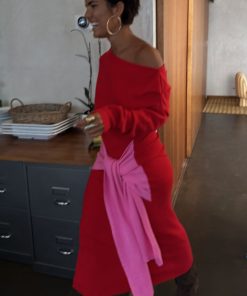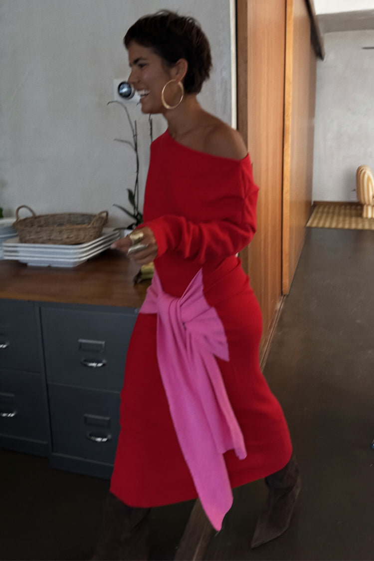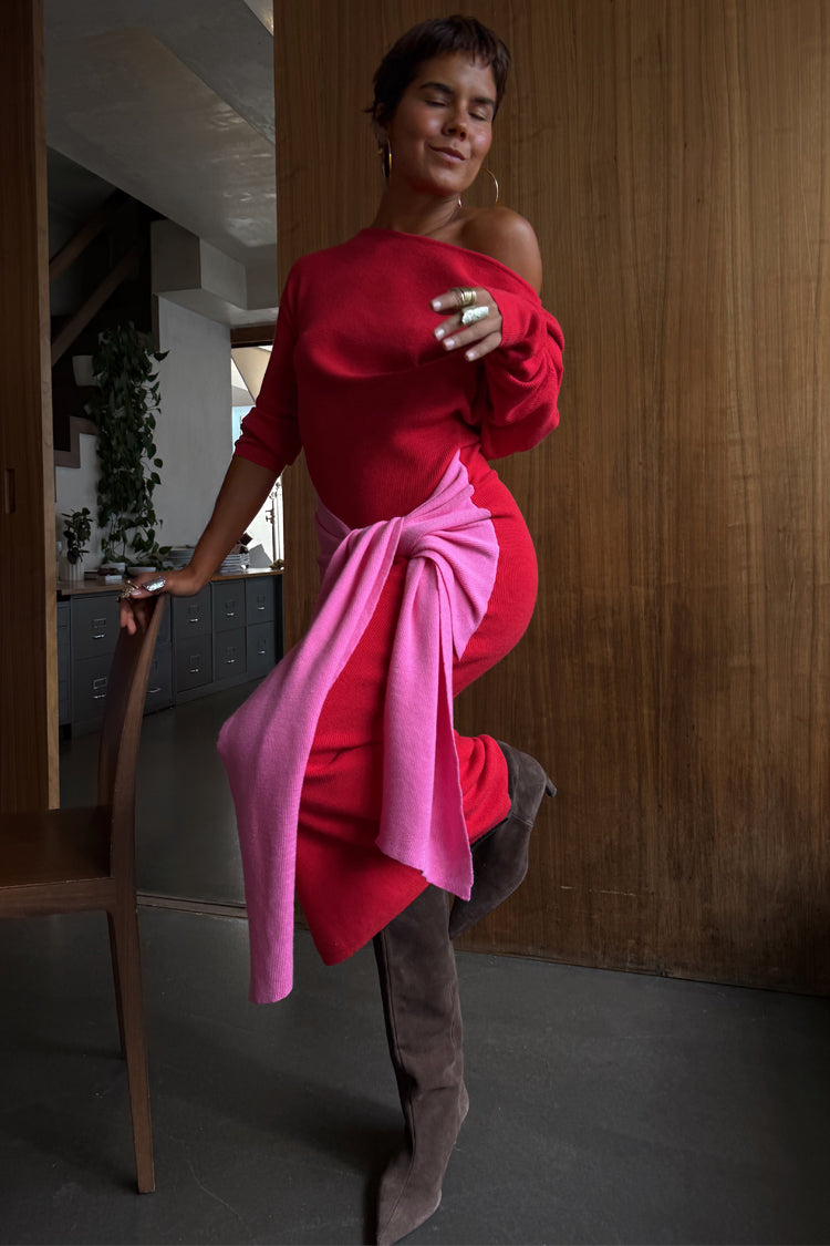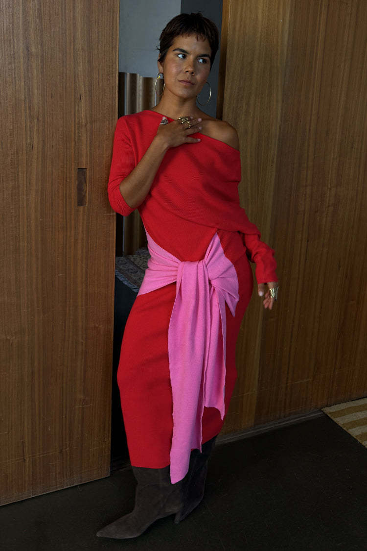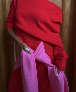 In true NFD fashion we’re adding a splash of colour to you autumn/winter season! In a soft touch knit base that’s keeping you warm through the colder seasons. With a tie waist in a contrast pink that can be style in a multitude of ways and a relaxed off the shoulder silhouette its a definite eye catcher!