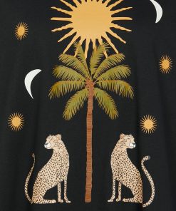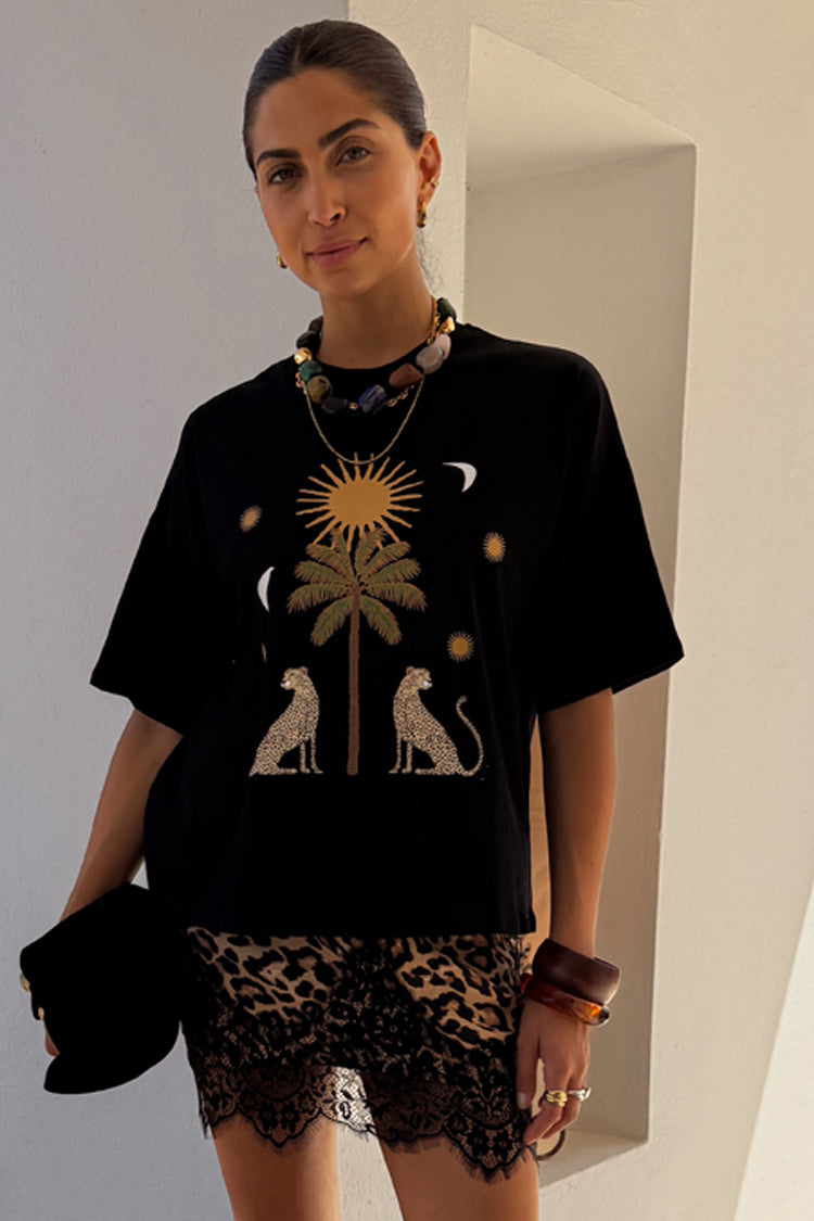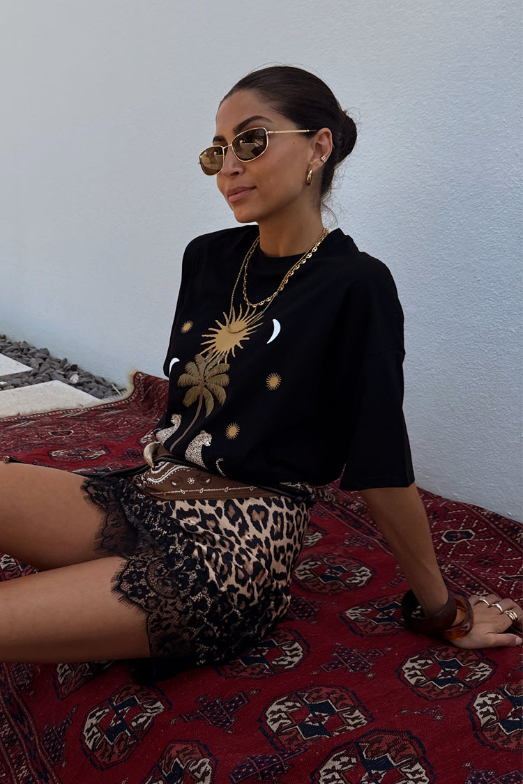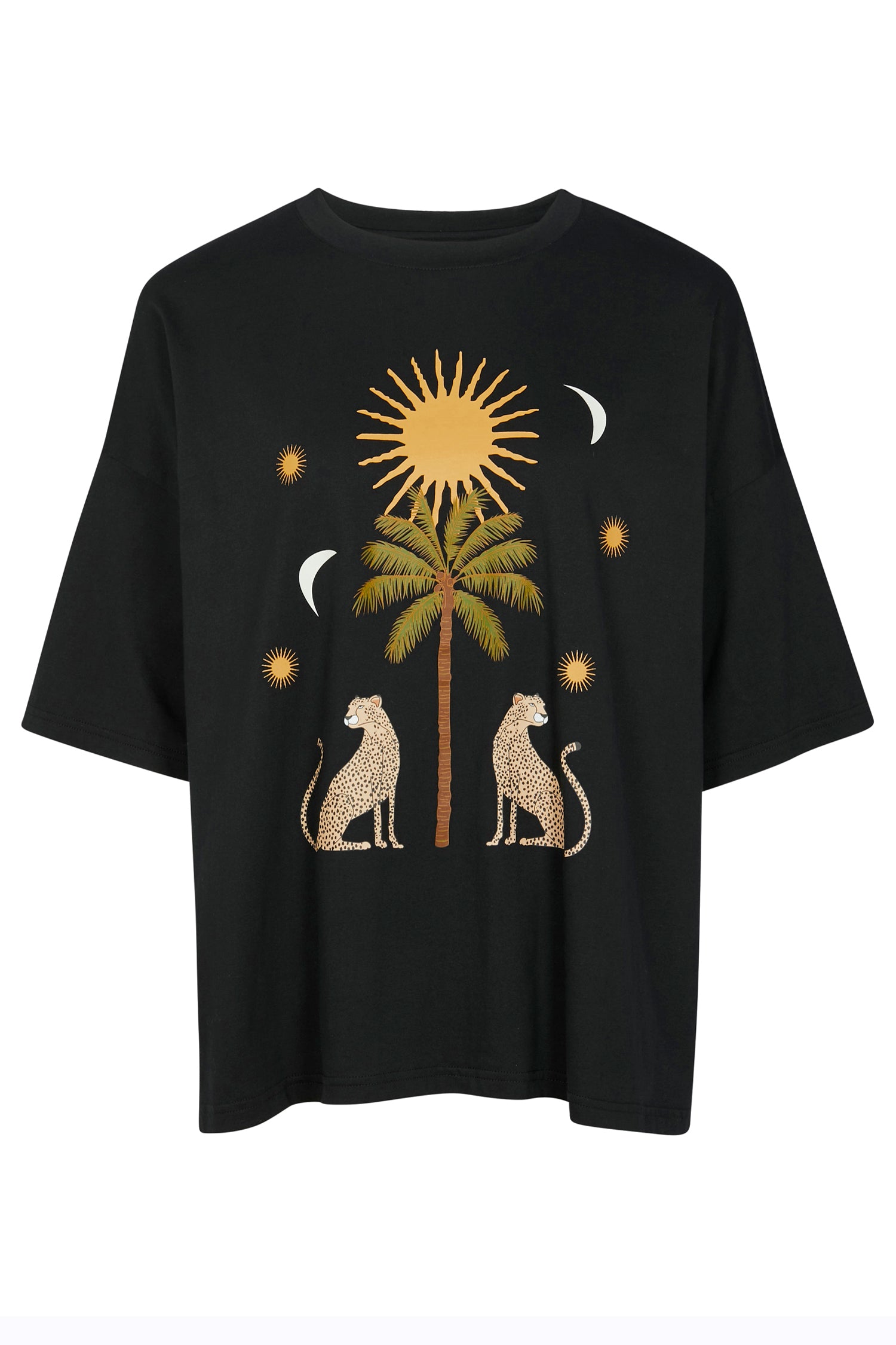 A simple tee printed with a bohemian style graphic print. Featuring our iconic leopard motifs, palms and sunshine. With a relaxed fit and dropped shoulder seams it’s an easy option whether your dressing down with jeans and trainers or adding to a blazer and our leopard maeva for a casual night out!