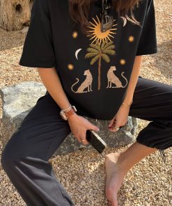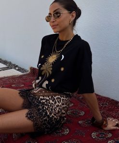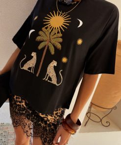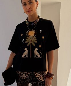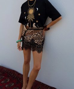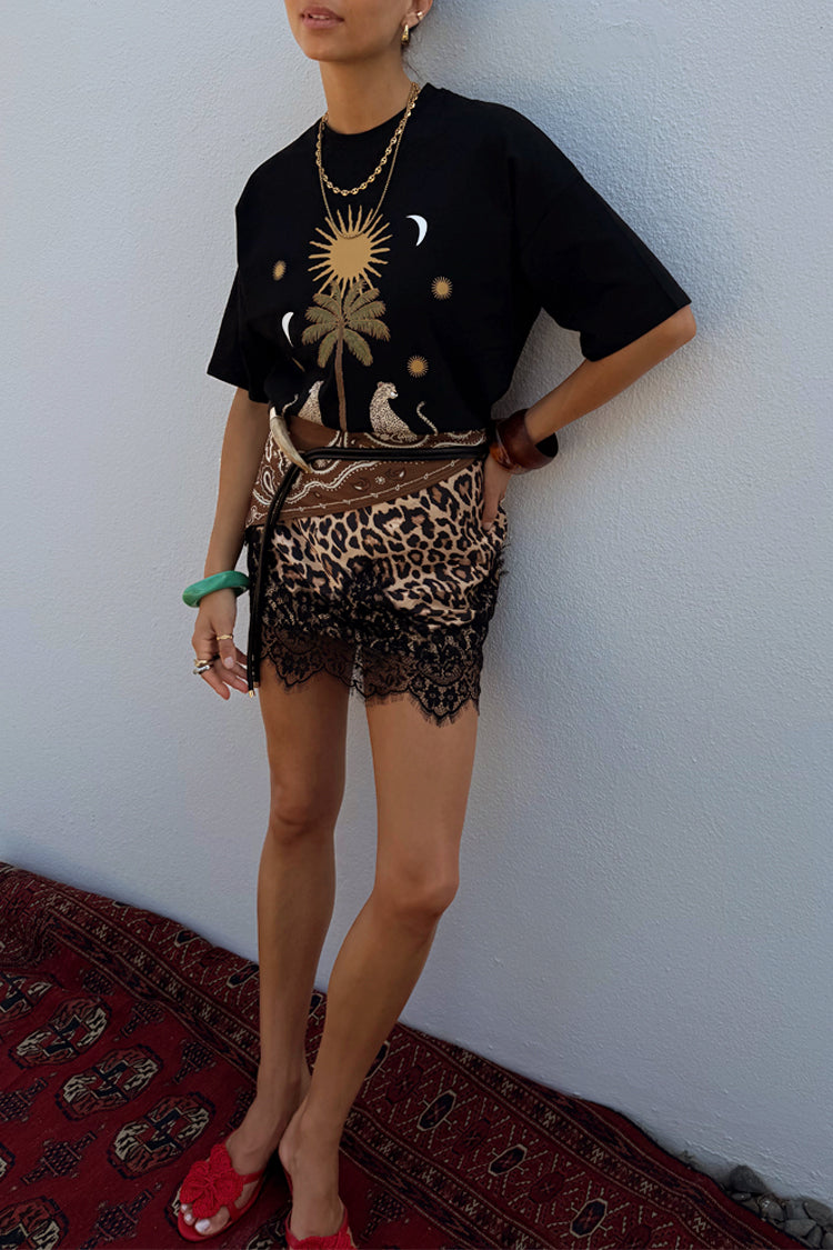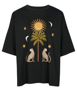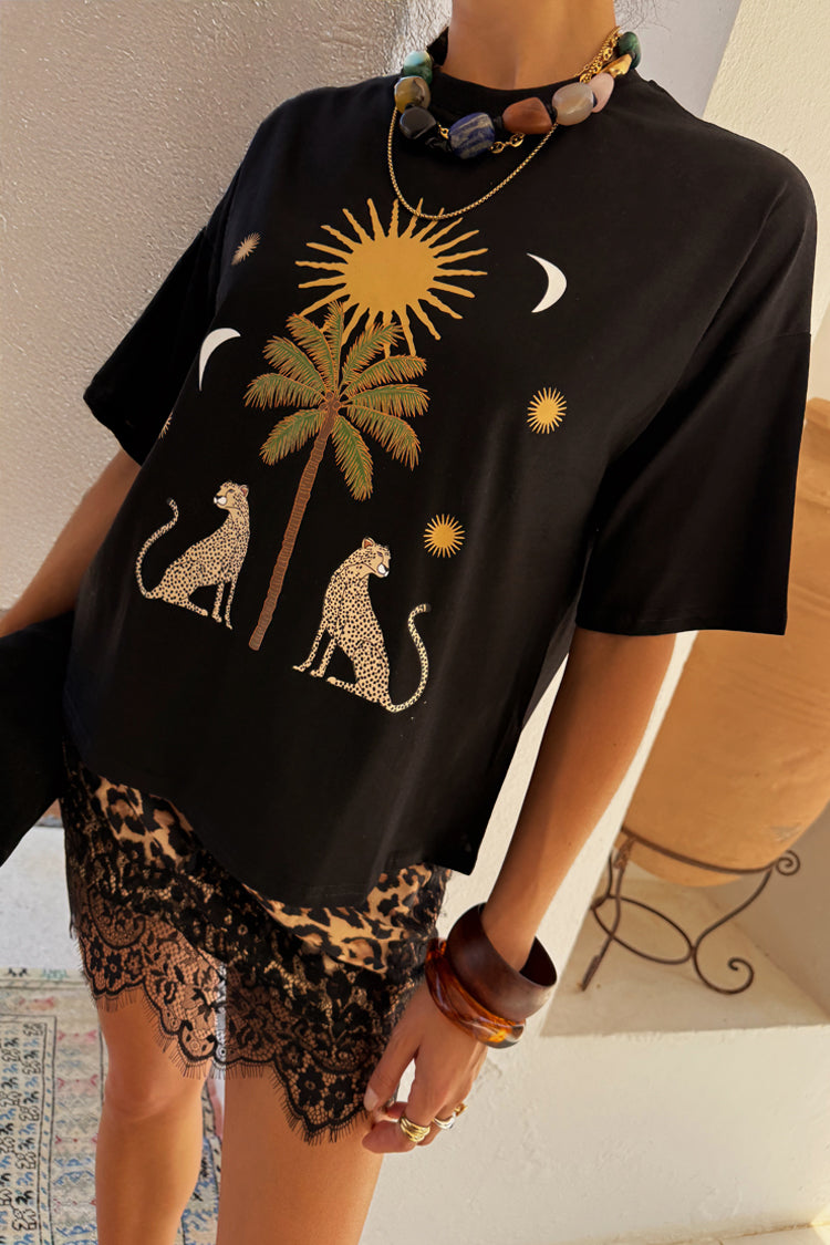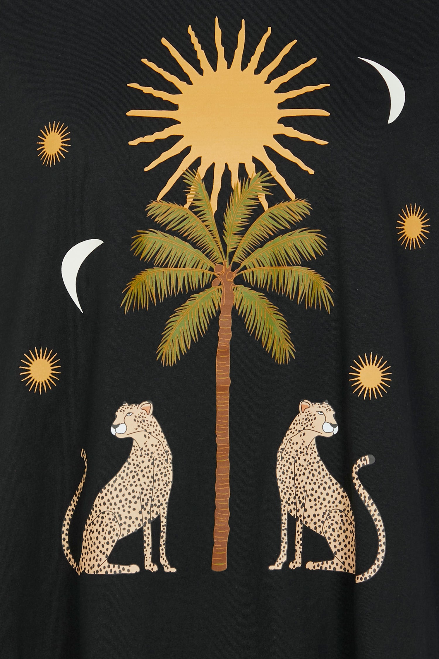 A simple tee printed with a bohemian style graphic print. Featuring our iconic leopard motifs, palms and sunshine. With a relaxed fit and dropped shoulder seams it’s an easy option whether your dressing down with jeans and trainers or adding to a blazer and our leopard maeva for a casual night out!