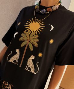 A simple tee printed with a bohemian style graphic print. Featuring our iconic leopard motifs, palms and sunshine. With a relaxed fit and dropped shoulder seams it’s an easy option whether your dressing down with jeans and trainers or adding to a blazer and our leopard maeva for a casual night out!