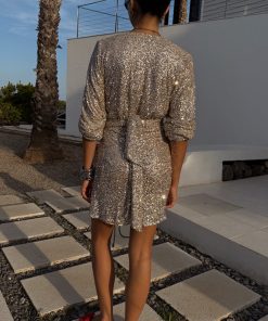 Designed with a voluminous bodice and an adjustable wrap waist you can tie in a multitude of styles. Tie it more open for that sexy drape effect, or tight for more coverage on the legs. Lathered in silver sequins to make to give it and elegantly dressy feel. A wonderfully versatile and classic piece.