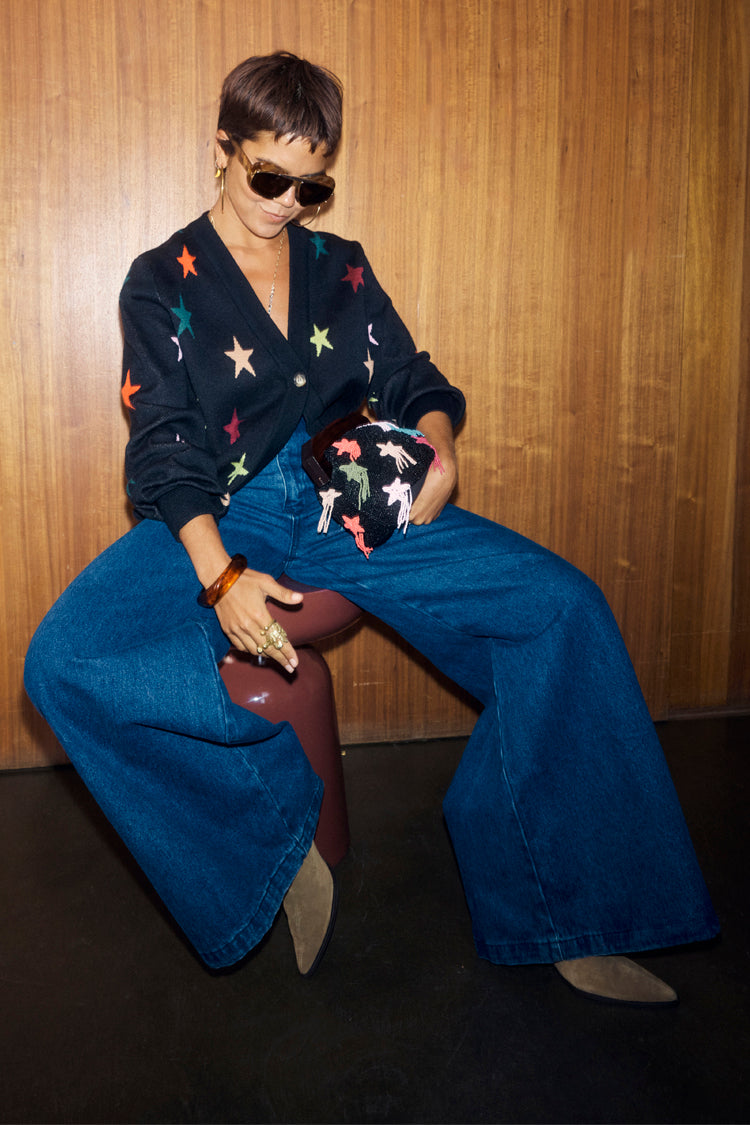 A knit base we are truly proud of – a soft touch base, in a slightly boxy fit, that feels so weighty and luxe. With a multicoloured star print that adds that touch of NFD flare! With chunky buttons that elevate the simple silhouette even further, making it an easy styling essential.