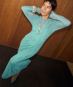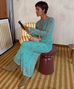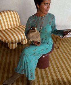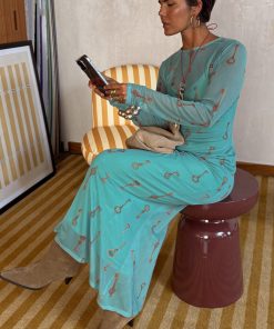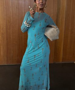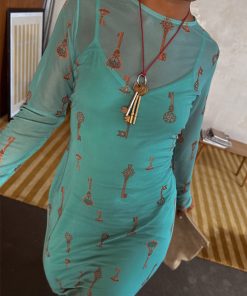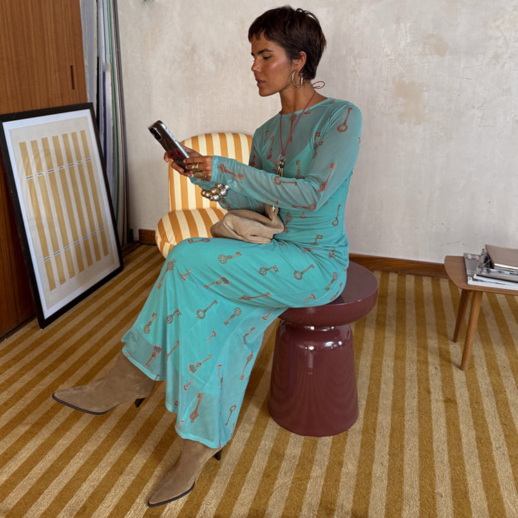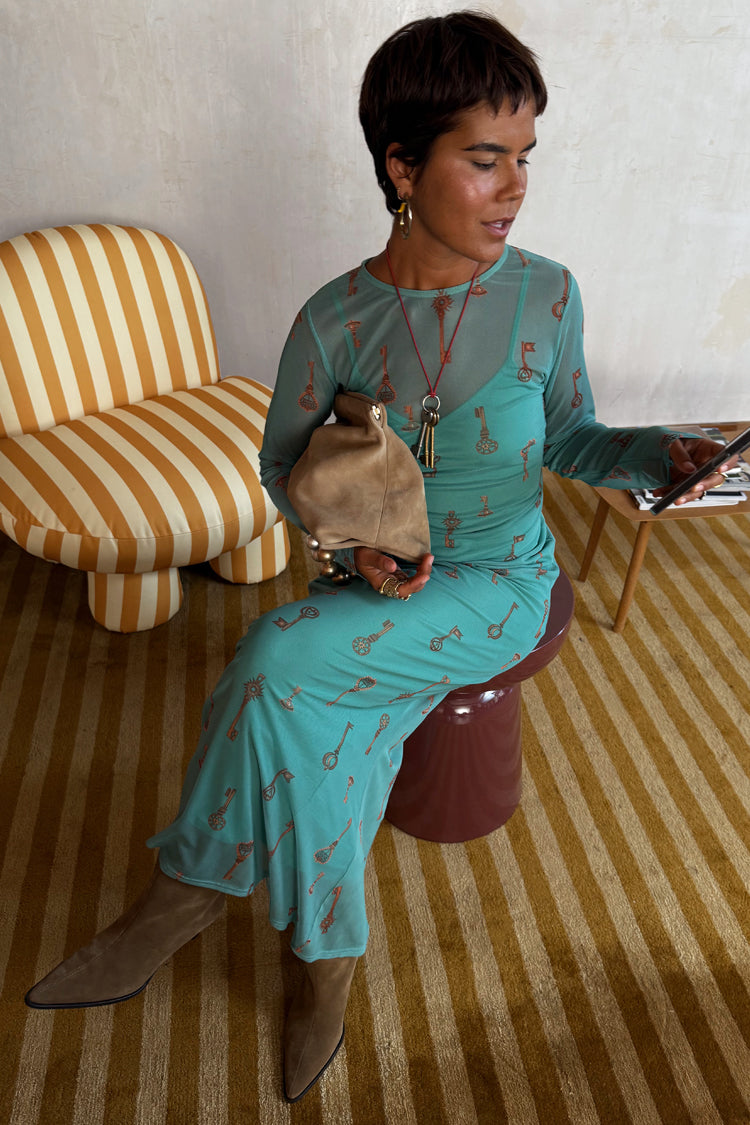 In our bestselling mesh fabric, designed and created in the UK, with lots of stretch and movability. A subtle turquoise base with our new key print, hand painted and inspired by intricate little charms found at Kempton market. The silky soft base makes it the perfect dress to be worn throughout the seasons, layer over underwear for a slightly sexier approach or add some coverage with the slip and pair with some kitten heels for an easy office to evening look. The fit is so flattering, it really skims the curves and defines the waist.